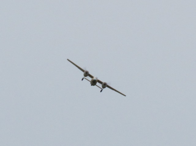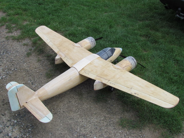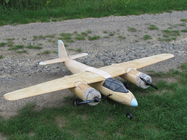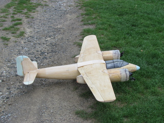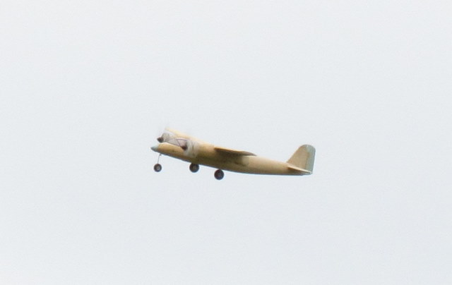 Es ist der 17.6.11: Die Maschine ist bestückt mit 6S 3200 Lipos und 2 x Ultra 1300/9 (ja, es gibt sie noch, die guten alten Bürstenmotoren!), Strom im Stand: 40A. Noch ist die Leistung recht moderat, aber die Maschine ist ausgelegt bis zu 8S. Die ersten Rollversuche funktionieren zufriedenstellend, das Fahrwerk erscheint ausreichend stabil. Bei etwas mehr Beschleunigung klare Tendenz zum Abheben, dabei gute Flugstabilität erkennbar.